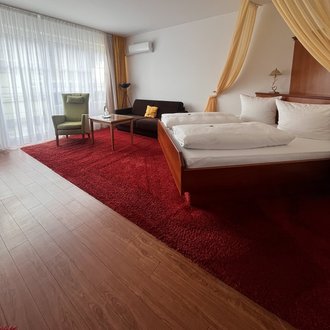 Doppelzimmer mit einer Größe von ca. 26 m² mit Balkon zur Gartenseite.