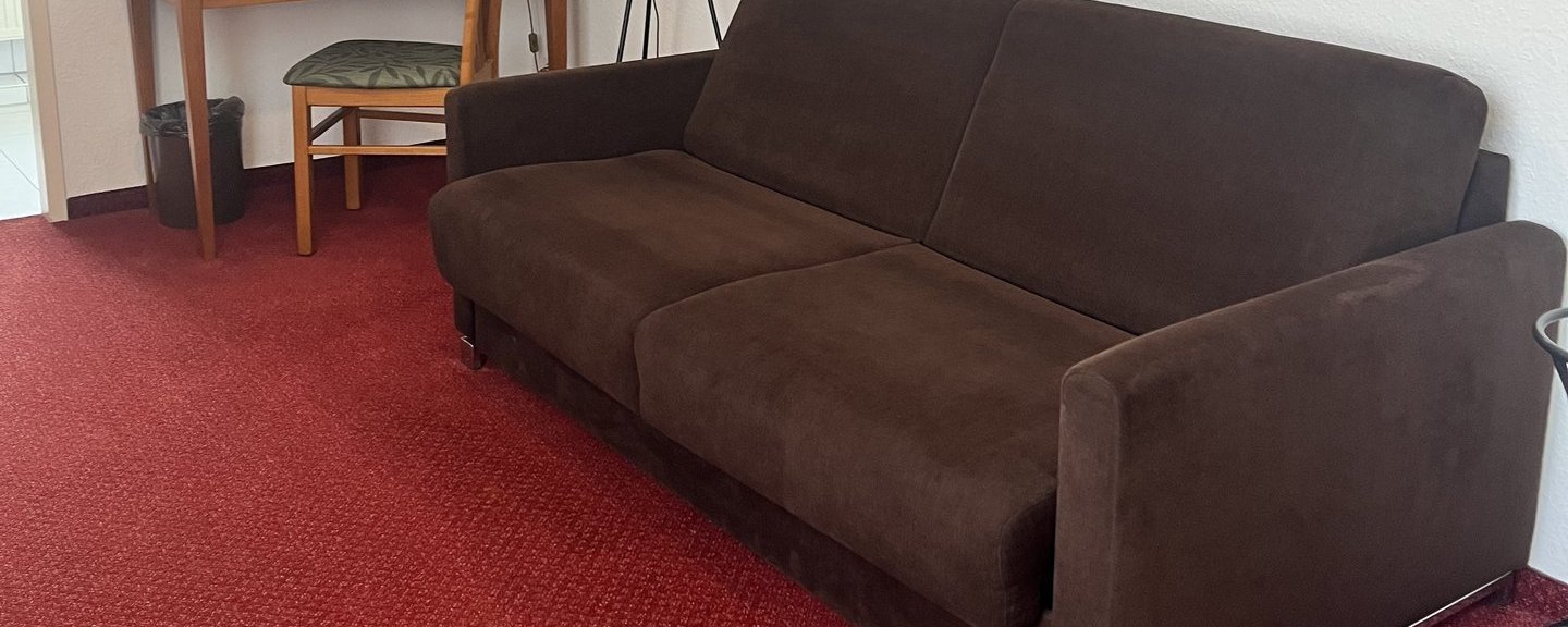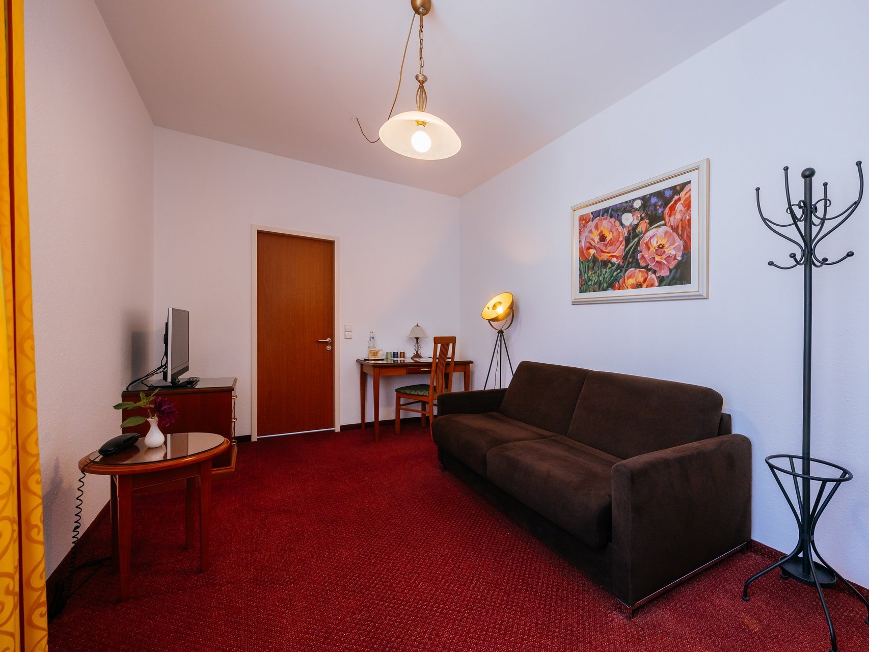 Wohnstudio mit separatem Schlafzimmer und Wohnraum ohne Balkon. Größe ca. 30 qm. Inklusive Frühstück und Tiefgaragenstellplatz.